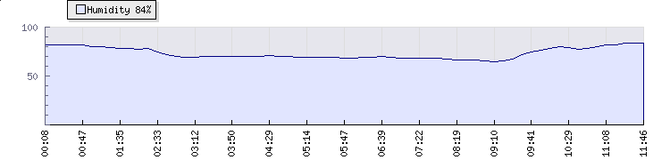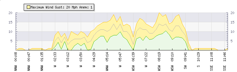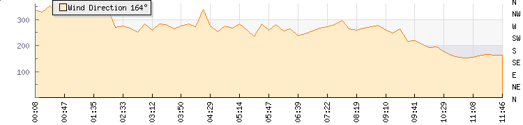 In the last few minutes the wind was Southerly at an average speed of 1 mph, reaching up to 1 mph and a low of 0 mph. The gust strength is1 mph above the minimum speed |