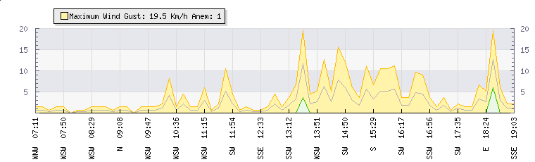 In the last few minutes the wind was North North West at an average speed of 1 kmh, reaching up to 2 kmh and a low of 0 kmh. The gust strength is2 kmh above the minimum speed |