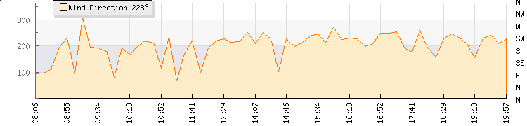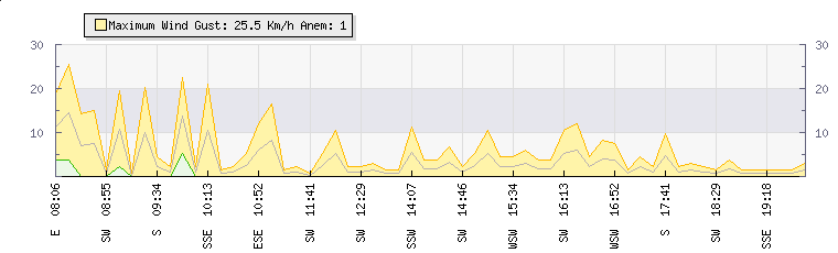 In the last few minutes the wind was West South West at an average speed of 4 kmh, reaching up to 8 kmh and a low of 0 kmh. The gust strength is8 kmh above the minimum speed |