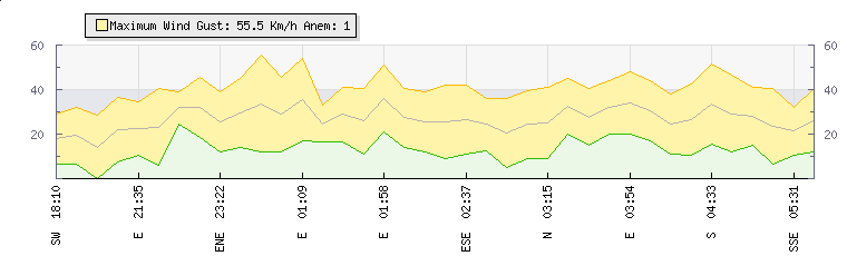 In the last few minutes the wind was Easterly at an average speed of 34 kmh, reaching up to 48 kmh and a low of 20 kmh. The gust strength is28 kmh above the minimum speed |