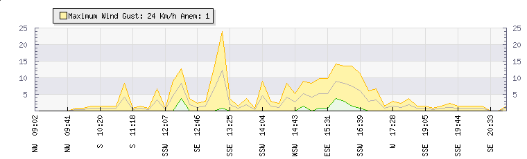 In the last few minutes the wind was East South East at an average speed of 1 kmh, reaching up to 1 kmh and a low of 0 kmh. The gust strength is1 kmh above the minimum speed |