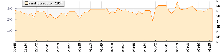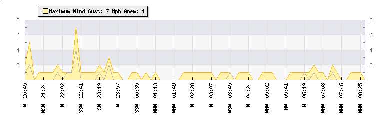 In the last few minutes the wind was West North West at an average speed of 1 mph, reaching up to 1 mph and a low of 0 mph. The gust strength is1 mph above the minimum speed |