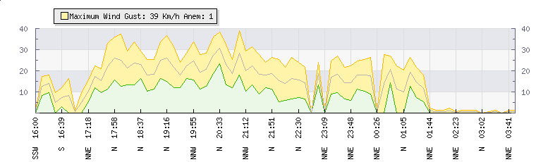 In the last few minutes the wind was North North East at an average speed of 1 kmh, reaching up to 1 kmh and a low of 0 kmh. The gust strength is1 kmh above the minimum speed |