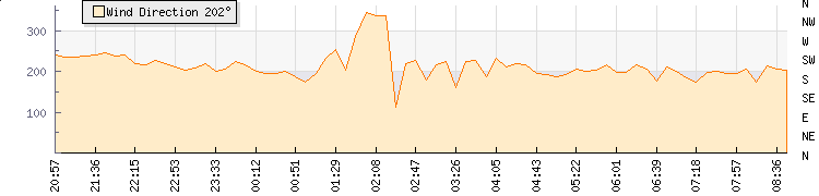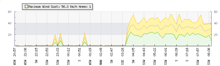 In the last few minutes the wind was Southerly at an average speed of 37 kmh, reaching up to 50 kmh and a low of 24 kmh. The gust strength is26 kmh above the minimum speed |