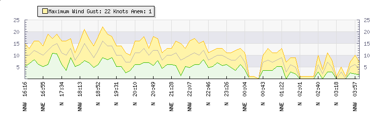 In the last few minutes the wind was North North East at an average speed of 1 knots, reaching up to 1 knots and a low of 0 knots. The gust strength is1 knots above the minimum speed |