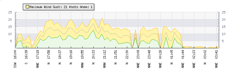 In the last few minutes the wind was North North East at an average speed of 0 knots, reaching up to 0 knots and a low of 0 knots. The gust strength is0 knots above the minimum speed |