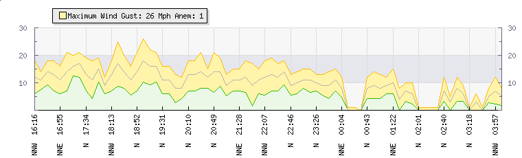 In the last few minutes the wind was North North East at an average speed of 1 mph, reaching up to 1 mph and a low of 0 mph. The gust strength is1 mph above the minimum speed |