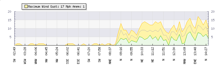 In the last few minutes the wind was North North West at an average speed of 6 mph, reaching up to 10 mph and a low of 1 mph. The gust strength is9 mph above the minimum speed |
