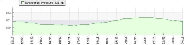 | Wind Speed: | 0|0|0 kmh | Wind Direction: | E 82° | Temperature: | 11.9°C | | Wet Bulb: | 11.8°C | Discomfort: | 60 | Humidity: | 100% | | Rainfall Today: | 5.6mm | 12 hrs Rainfall: | 4.8mm | 24 hrs Rainfall: | 5.6mm | | Barometer: | 832.1mb | Dew Point: | 11.9°C | Density-Alt: | 13448ft (4099 m) | | Fire Danger: | |