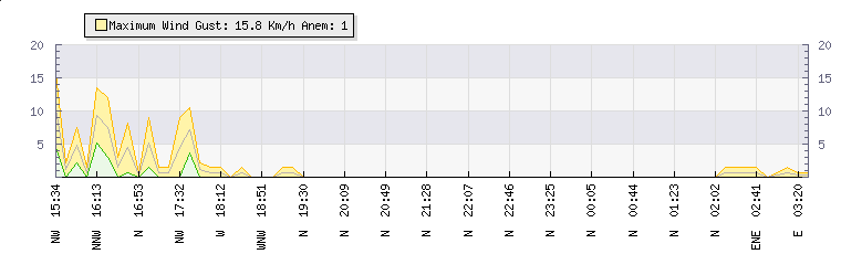 In the last few minutes the wind was Northerly at an average speed of 0 kmh, reaching up to 0 kmh and a low of 0 kmh. The gust strength is0 kmh above the minimum speed |