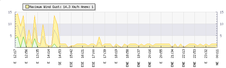 In the last few minutes the wind was Easterly at an average speed of 0 kmh, reaching up to 0 kmh and a low of 0 kmh. The gust strength is0 kmh above the minimum speed |