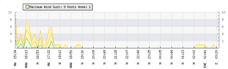In the last few minutes the wind was Northerly at an average speed of 0 knots, reaching up to 0 knots and a low of 0 knots. The gust strength is0 knots above the minimum speed |