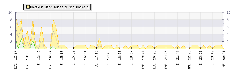 In the last few minutes the wind was Easterly at an average speed of 0 mph, reaching up to 0 mph and a low of 0 mph. The gust strength is0 mph above the minimum speed |
