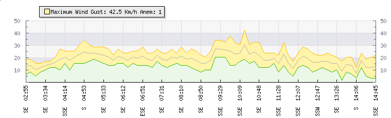 In the last few minutes the wind was South South West at an average speed of 17 kmh, reaching up to 24 kmh and a low of 10 kmh. The gust strength is14 kmh above the minimum speed |