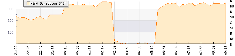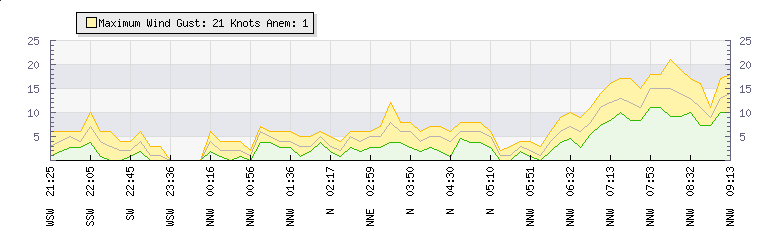 In the last few minutes the wind was North North West at an average speed of 1 knots, reaching up to 2 knots and a low of 0 knots. The gust strength is2 knots above the minimum speed |