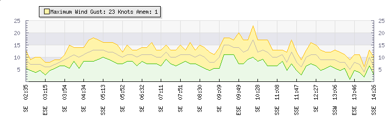 In the last few minutes the wind was South South East at an average speed of 9 knots, reaching up to 12 knots and a low of 6 knots. The gust strength is6 knots above the minimum speed |