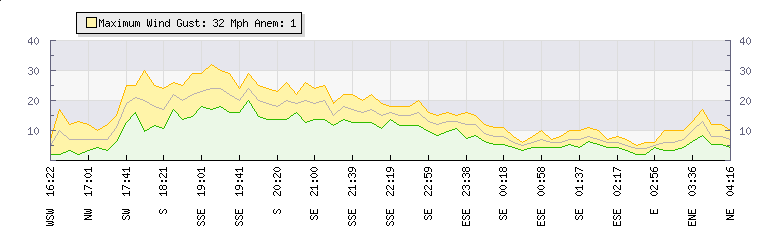 In the last few minutes the wind was Easterly at an average speed of 5 mph, reaching up to 7 mph and a low of 3 mph. The gust strength is4 mph above the minimum speed |