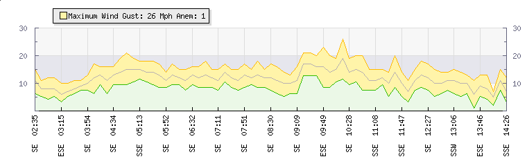 In the last few minutes the wind was South South East at an average speed of 11 mph, reaching up to 14 mph and a low of 7 mph. The gust strength is7 mph above the minimum speed |