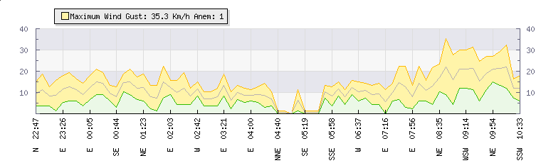 In the last few minutes the wind was Easterly at an average speed of 13 kmh, reaching up to 22 kmh and a low of 5 kmh. The gust strength is17 kmh above the minimum speed |