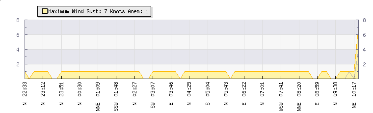 In the last few minutes the wind was Northerly at an average speed of 1 knots, reaching up to 1 knots and a low of 0 knots. The gust strength is1 knots above the minimum speed |