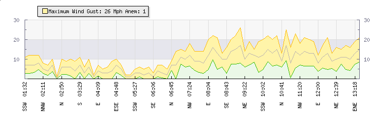 In the last few minutes the wind was South Westerly at an average speed of 15 mph, reaching up to 22 mph and a low of 7 mph. The gust strength is15 mph above the minimum speed |