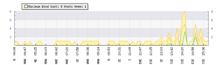 In the last few minutes the wind was West South West at an average speed of 1 knots, reaching up to 1 knots and a low of 0 knots. The gust strength is1 knots above the minimum speed |