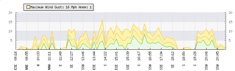 In the last few minutes the wind was South South East at an average speed of 5 mph, reaching up to 8 mph and a low of 3 mph. The gust strength is5 mph above the minimum speed |