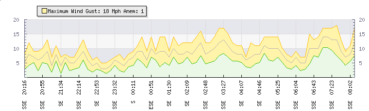 | Wind Gust: | 17 mph | Min Temp: | 21.1 °C | Max Temp: | 21.9 °C | | Wind Average: | 12 mph | Min Hum: | 88 % | Max Hum: | 93 % | |  |