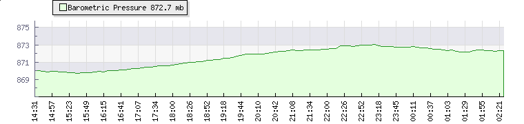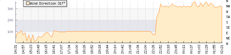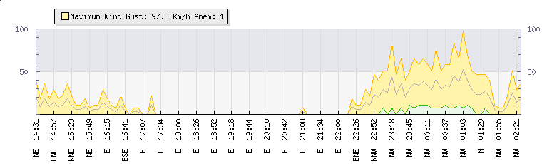 In the last few minutes the wind was North Westerly at an average speed of 38 kmh, reaching up to 65 kmh and a low of 11 kmh. The gust strength is54 kmh above the minimum speed |