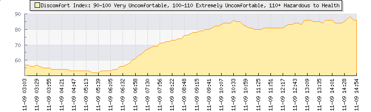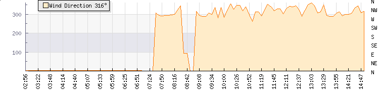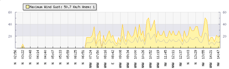 In the last few minutes the wind was North Westerly at an average speed of 11 kmh, reaching up to 22 kmh and a low of 0 kmh. The gust strength is22 kmh above the minimum speed |