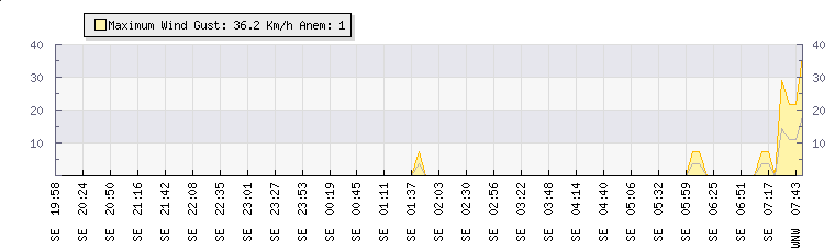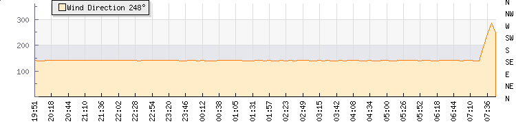 In the last few minutes the wind was South Easterly at an average speed of 0 kmh, reaching up to 0 kmh and a low of 0 kmh. The gust strength is0 kmh above the minimum speed |