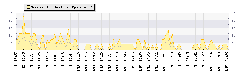 In the last few minutes the wind was Northerly at an average speed of 2 mph, reaching up to 4 mph and a low of 0 mph. The gust strength is4 mph above the minimum speed |