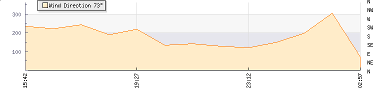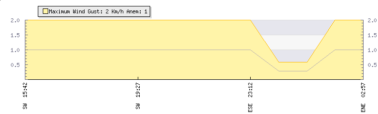In the last few minutes the wind was West North West at an average speed of 1 kmh, reaching up to 2 kmh and a low of 0 kmh. The gust strength is2 kmh above the minimum speed |