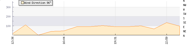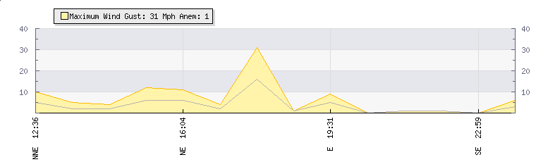 In the last few minutes the wind was Easterly at an average speed of 1 mph, reaching up to 1 mph and a low of 0 mph. The gust strength is1 mph above the minimum speed |