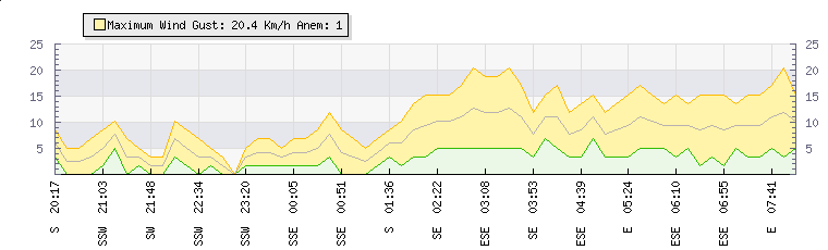 In the last few minutes the wind was East South East at an average speed of 9 kmh, reaching up to 15 kmh and a low of 2 kmh. The gust strength is13 kmh above the minimum speed |