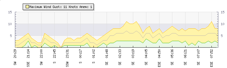 In the last few minutes the wind was East South East at an average speed of 5 knots, reaching up to 8 knots and a low of 1 knots. The gust strength is7 knots above the minimum speed |