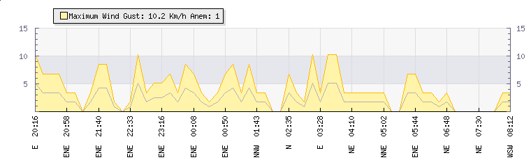 Weather Summary: In the last few minutes the wind was North Easterly at an average speed of 2 kmh, reaching up to 3 kmh and a low of 0 kmh. The gust strength is3 kmh above the minimum speed