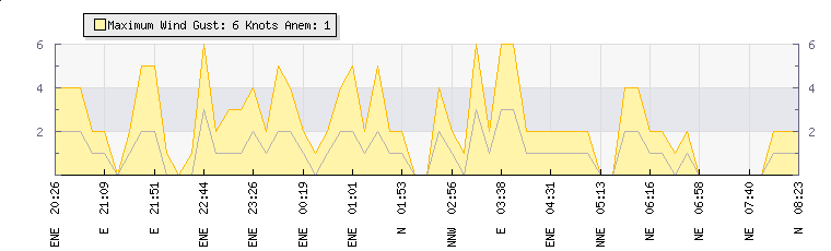 In the last few minutes the wind was North Easterly at an average speed of 1 knots, reaching up to 2 knots and a low of 0 knots. The gust strength is2 knots above the minimum speed |