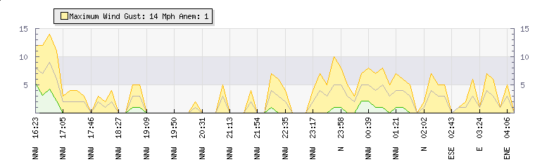 In the last few minutes the wind was Easterly at an average speed of 3 mph, reaching up to 6 mph and a low of 0 mph. The gust strength is6 mph above the minimum speed |