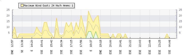In the last few minutes the wind was West South West at an average speed of 2 kmh, reaching up to 4 kmh and a low of 0 kmh. The gust strength is4 kmh above the minimum speed |