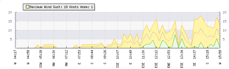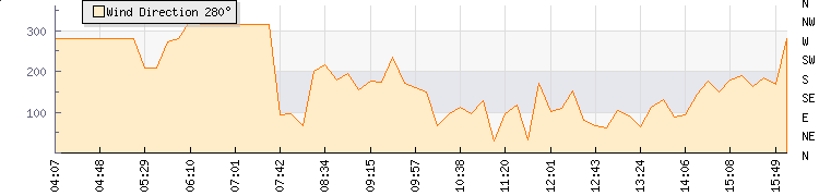 In the last few minutes the wind was Westerly at an average speed of 0 knots, reaching up to 0 knots and a low of 0 knots. The gust strength is0 knots above the minimum speed |