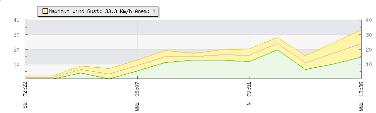In the last few minutes the wind was Westerly at an average speed of 4 kmh, reaching up to 6 kmh and a low of 1 kmh. The gust strength is5 kmh above the minimum speed |