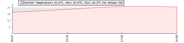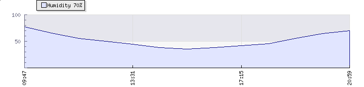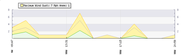 | Wind Gust: | 7 mph | Min Temp: | 15.5 °C | Max Temp: | 20.9 °C | | Wind Average: | 4 mph | Min Hum: | 36 % | Max Hum: | 100 % | |  |