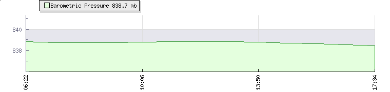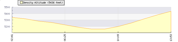 | Wind Speed: | 3|6|9 mph | Wind Direction: | WNW 287° | Temperature: | 20.7°C | | Wet Bulb: | 15.3°C | Discomfort: | 77 | Humidity: | 58% | | Rainfall Today: | 0.3mm | 12 hrs Rainfall: | 0.3mm | 24 hrs Rainfall: | 0.3mm | | Barometer: | 839mb | Dew Point: | 12.1°C | Clouds AGL: | 3425ft (1044 m) | | Density-Alt: | 7142ft (2177 m) | Solar Radiation: | 240Wm² | Fire Danger: | |