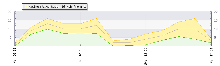| Wind Gust: | 16 mph | Min Temp: | 18.5 °C | Max Temp: | 20.7 °C | | Wind Average: | 13 mph | Min Hum: | 58 % | Max Hum: | 100 % | |  |