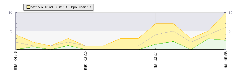 In the last few minutes the wind was North Westerly at an average speed of 4 mph, reaching up to 7 mph and a low of 1 mph. The gust strength is6 mph above the minimum speed |