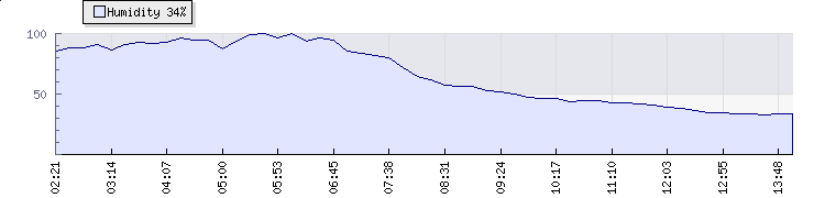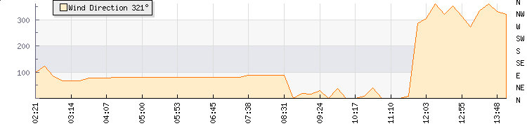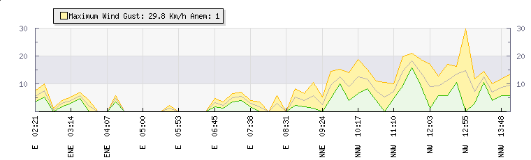 In the last few minutes the wind was North Westerly at an average speed of 11 kmh, reaching up to 17 kmh and a low of 6 kmh. The gust strength is11 kmh above the minimum speed |