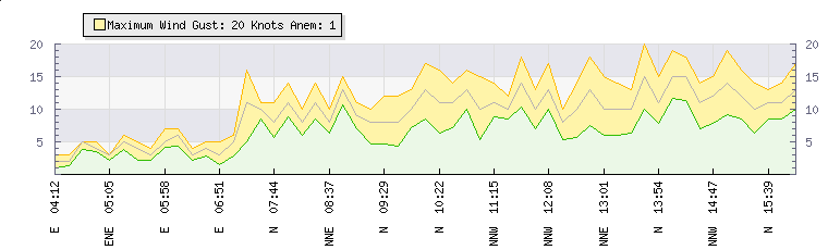 In the last few minutes the wind was South Easterly at an average speed of 22 knots, reaching up to 27 knots and a low of 17 knots. The gust strength is10 knots above the minimum speed |