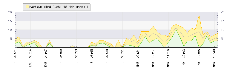 In the last few minutes the wind was North Westerly at an average speed of 7 mph, reaching up to 11 mph and a low of 4 mph. The gust strength is7 mph above the minimum speed |