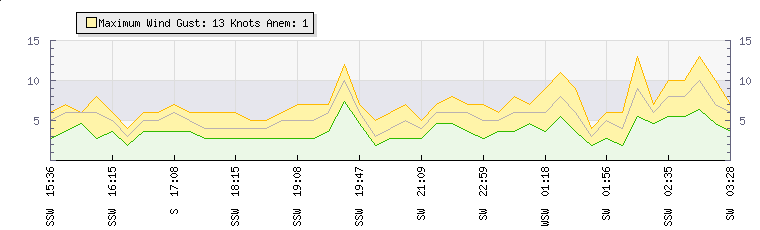 In the last few minutes the wind was South Westerly at an average speed of 3 knots, reaching up to 4 knots and a low of 2 knots. The gust strength is2 knots above the minimum speed |